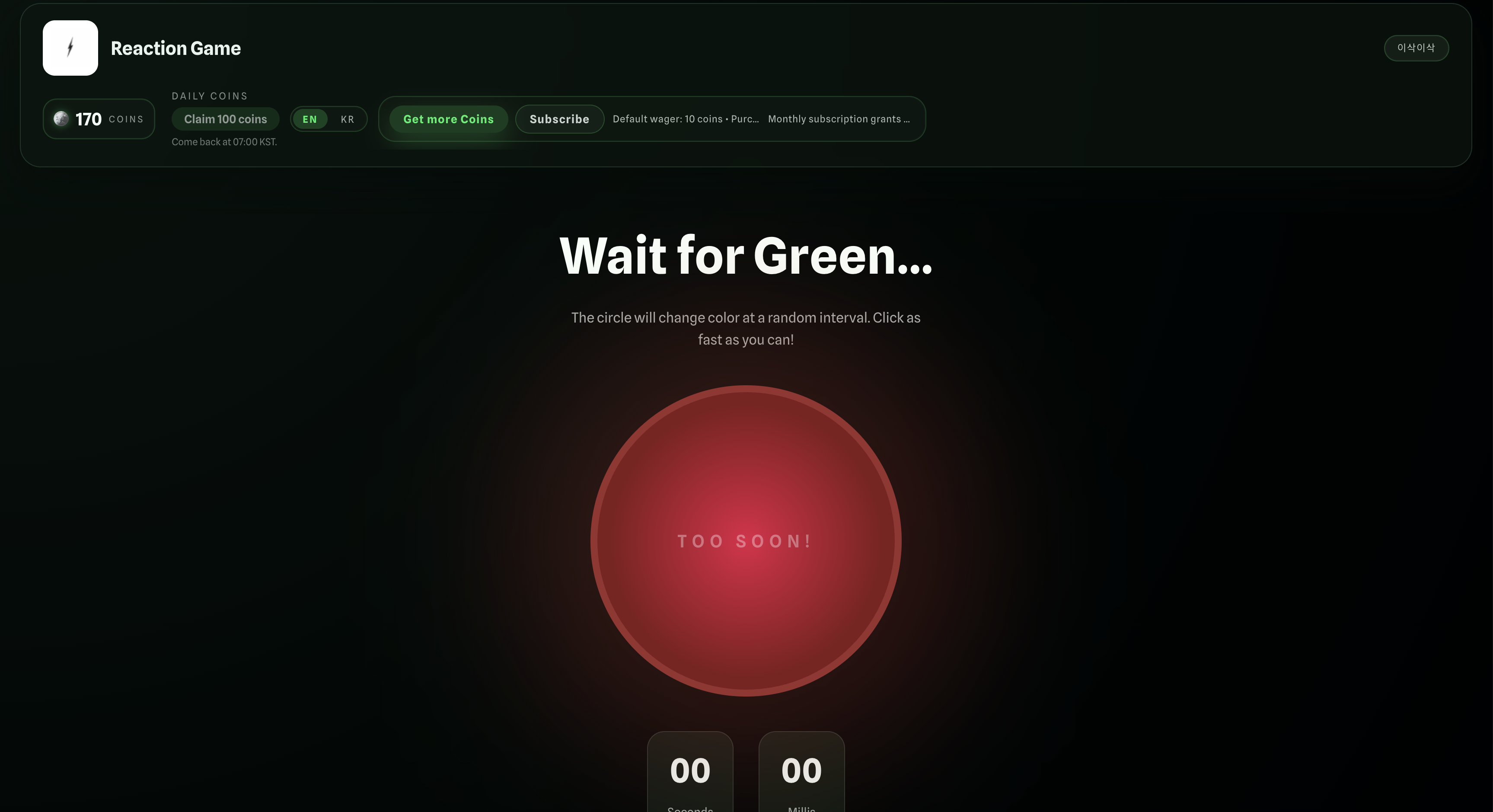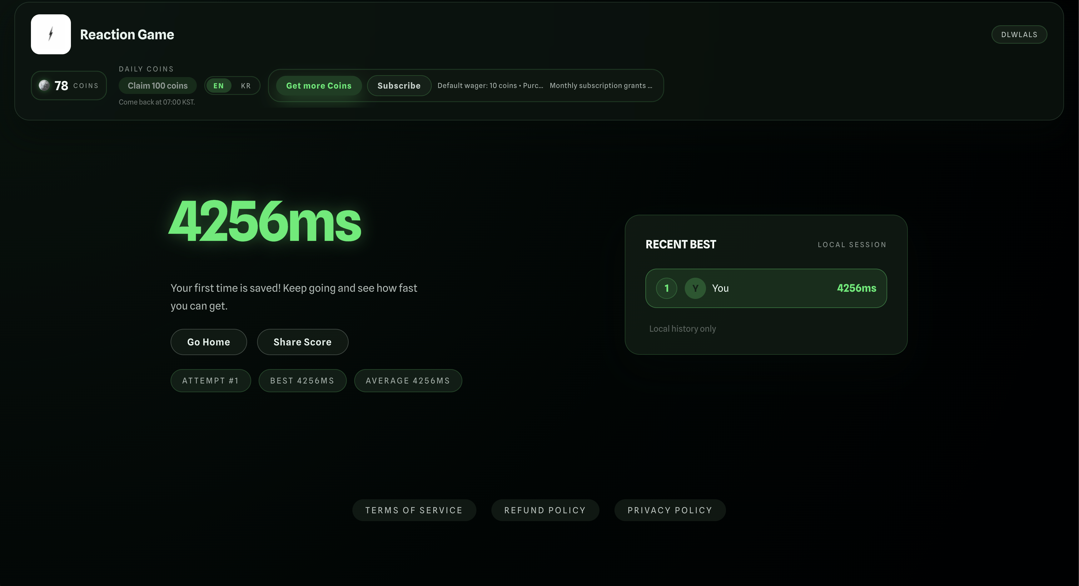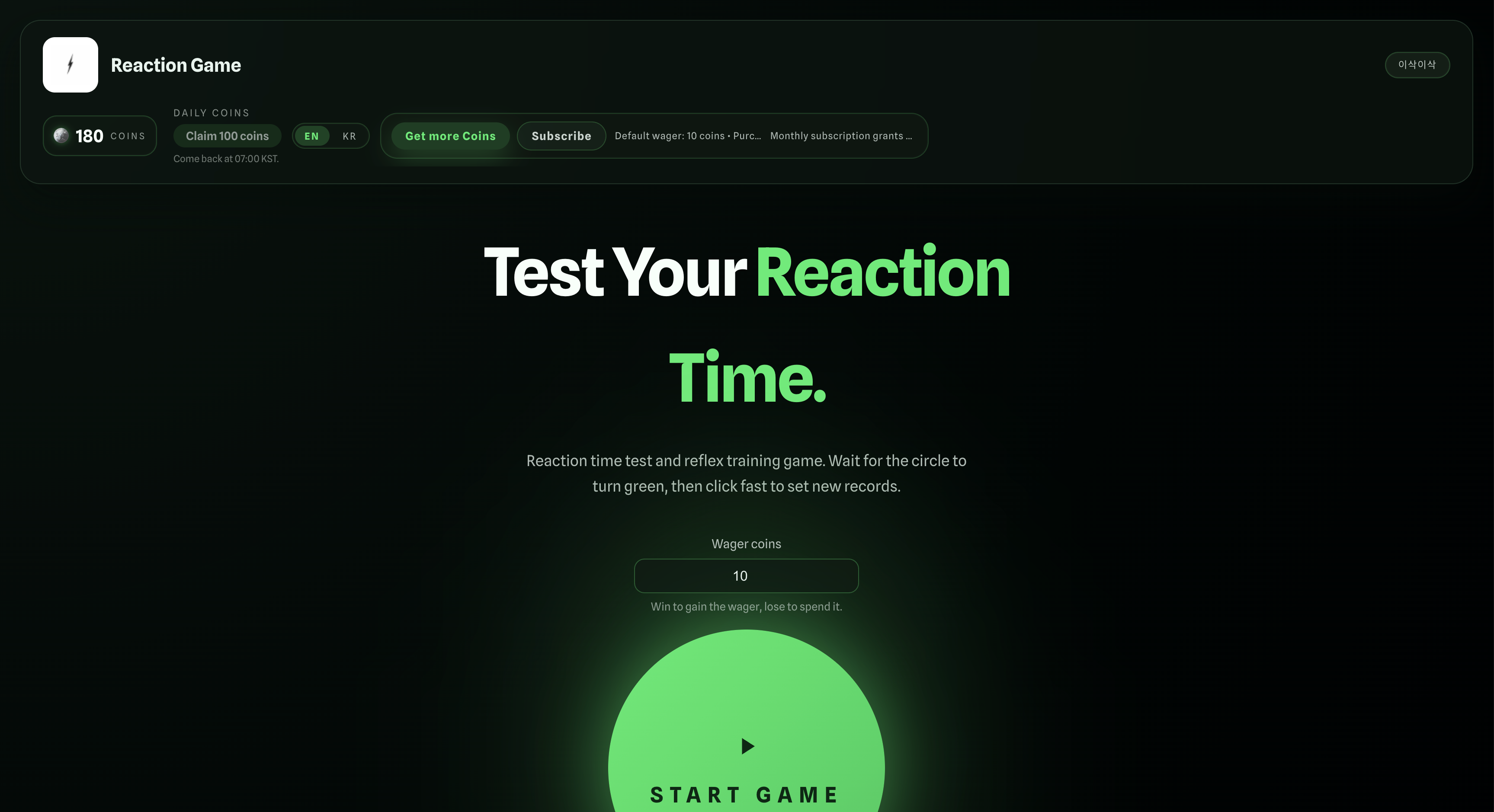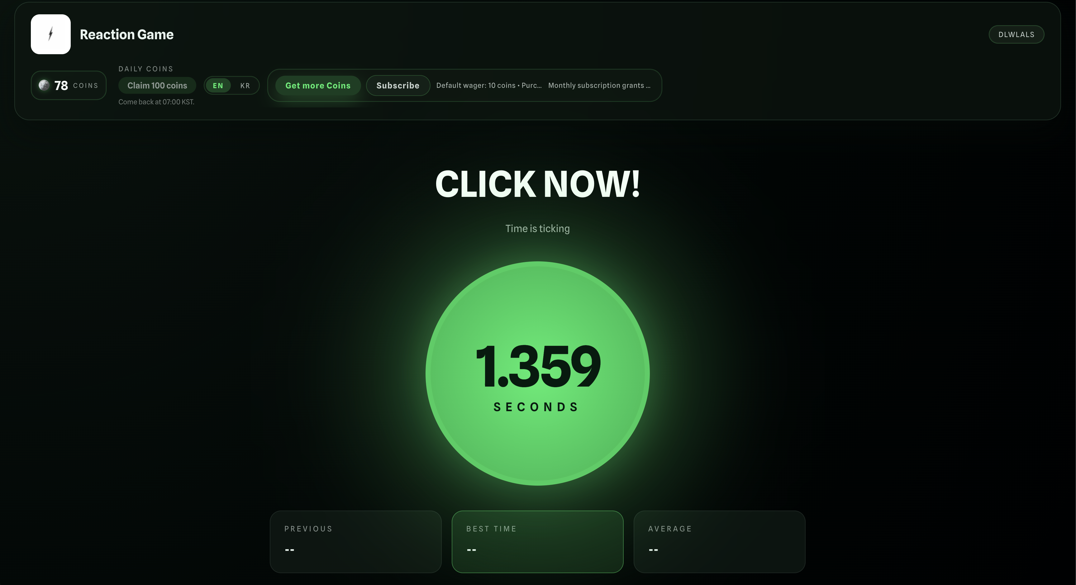 Reaction Game is a fast-paced reflex training game. Wait for the circle to turn green, then click as quickly as possible to record your reaction time. Track your best runs, view your averages, and challenge yourself to improve with every attempt. Simple to play, hard to master—perfect for short sessions and speed lovers.